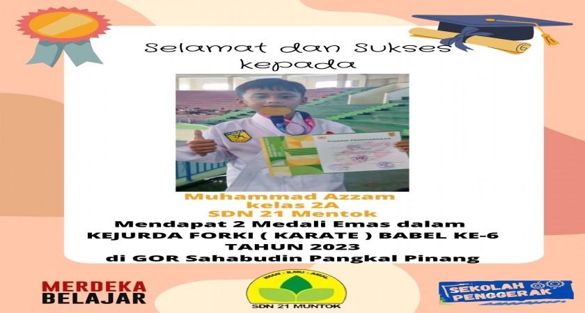 Alhamdulillah, atas ketekunan dan izin dari Allah Swt, Muhammad Azzam dari kelas 2A SDN 21 Mentok berhasil meraih 2 medali emas dalam kategori festival kumite usia dini kelas-30 kg dan open kumite usia dini kelas-30 kg. Tentu prestasinya sangat membanggakan bagi keluarga SDN 21 Mentok. Selamat dan sukses untuk ananda Muhammad Azzam, semoga prestasinya membawa keberkahan dan menjadi motivasi bagi teman-teman lain.